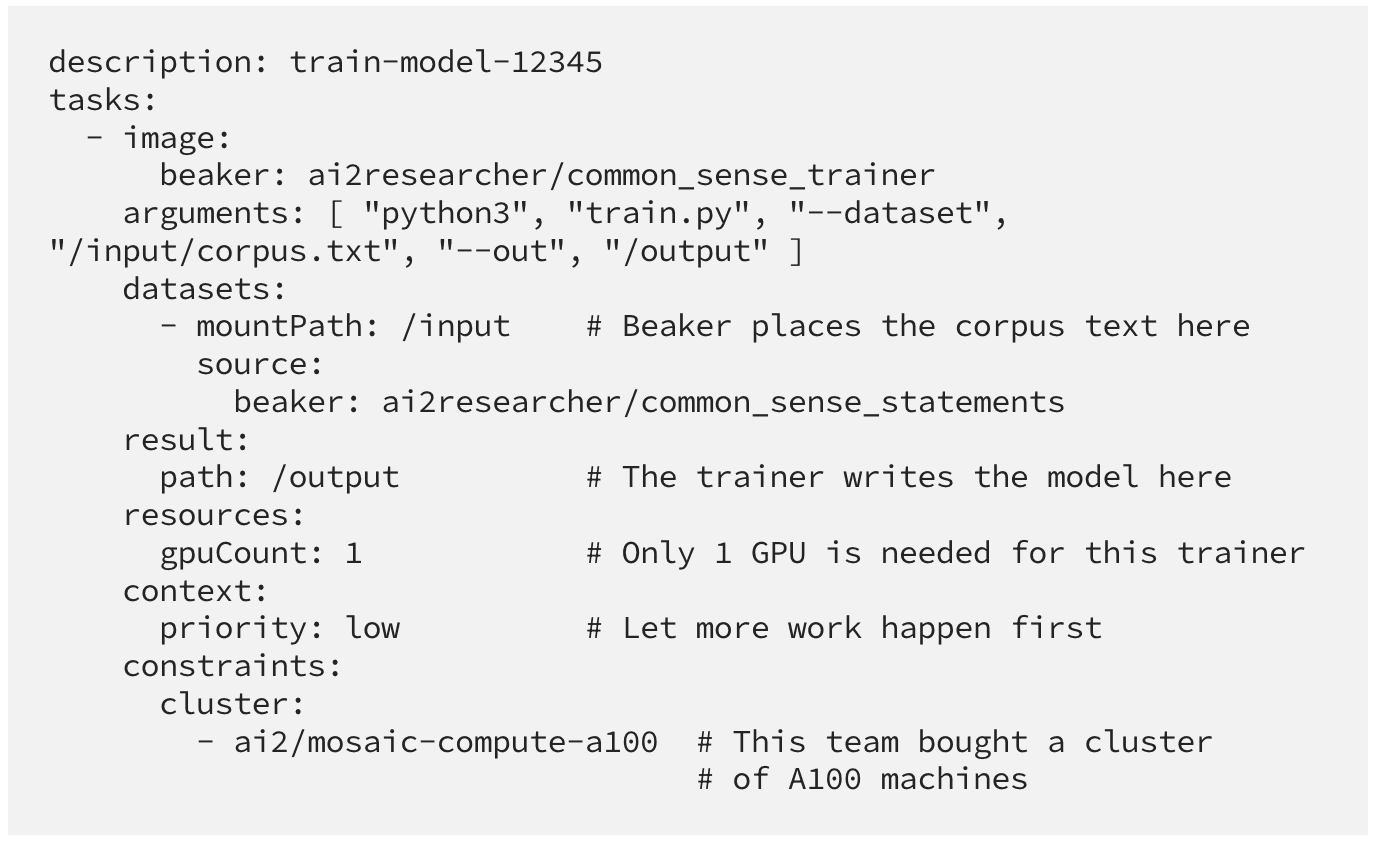Next we’ll want to train on a larger corpus. Using the same Beaker CLI program, we can upload the large corpus to Beaker (or use an existing corpus that someone already shared!) and tell Beaker how to run our code unattended. Here’s an example specification in YAML format: